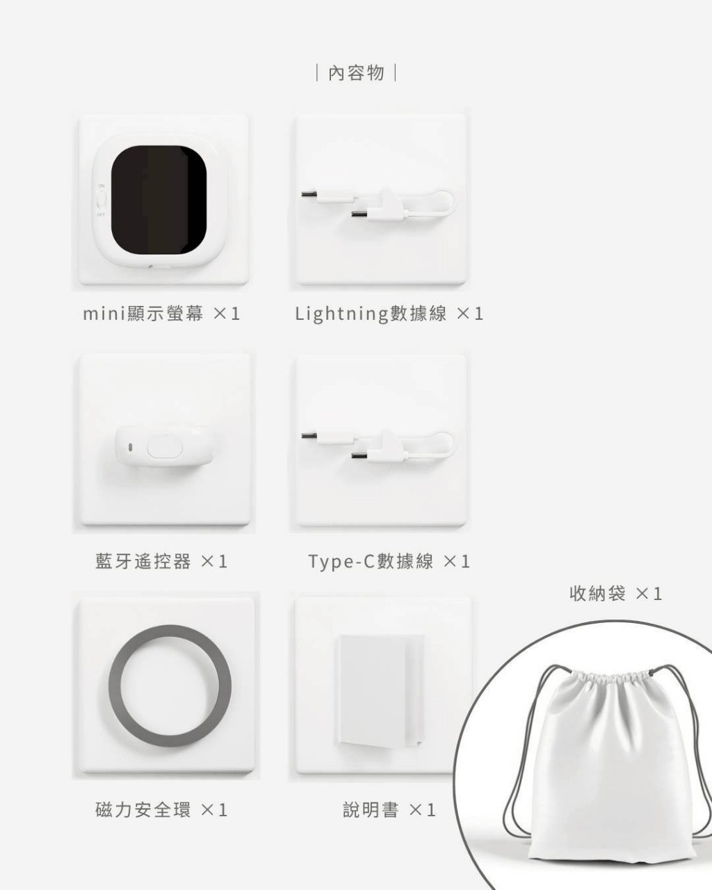 內容物:VLOGMATE 迷你顯示螢幕×1 / 數據線×2 / 磁力安全環×1 / 說明書×1 / 藍牙遙控器×1 / 收納袋×1