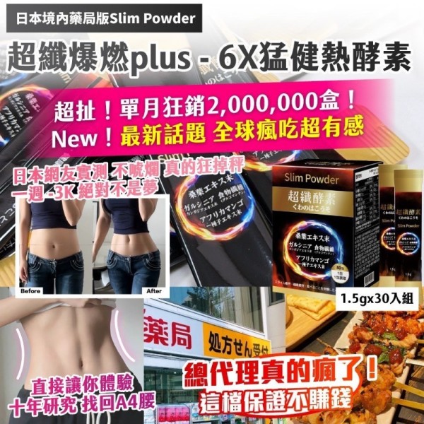 0308【日本境內藥局版 Slim Powder| 超纖爆燃 Plus - 6X 猛健熱酵素 1.5g x 30入組/ 盒第三團】