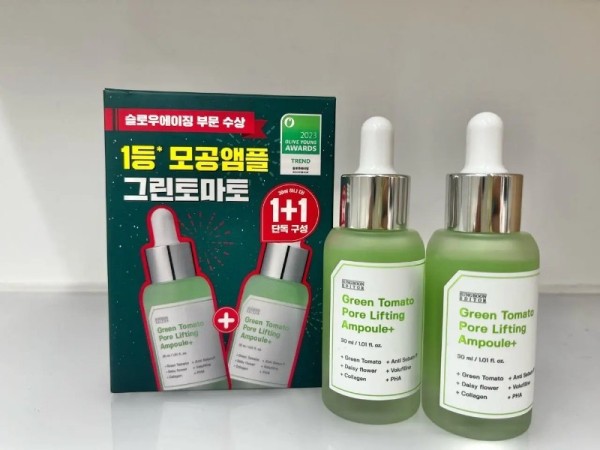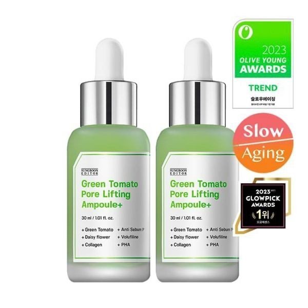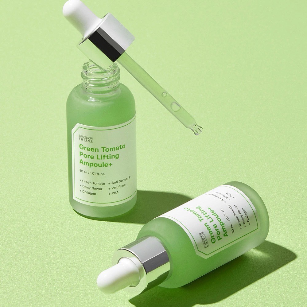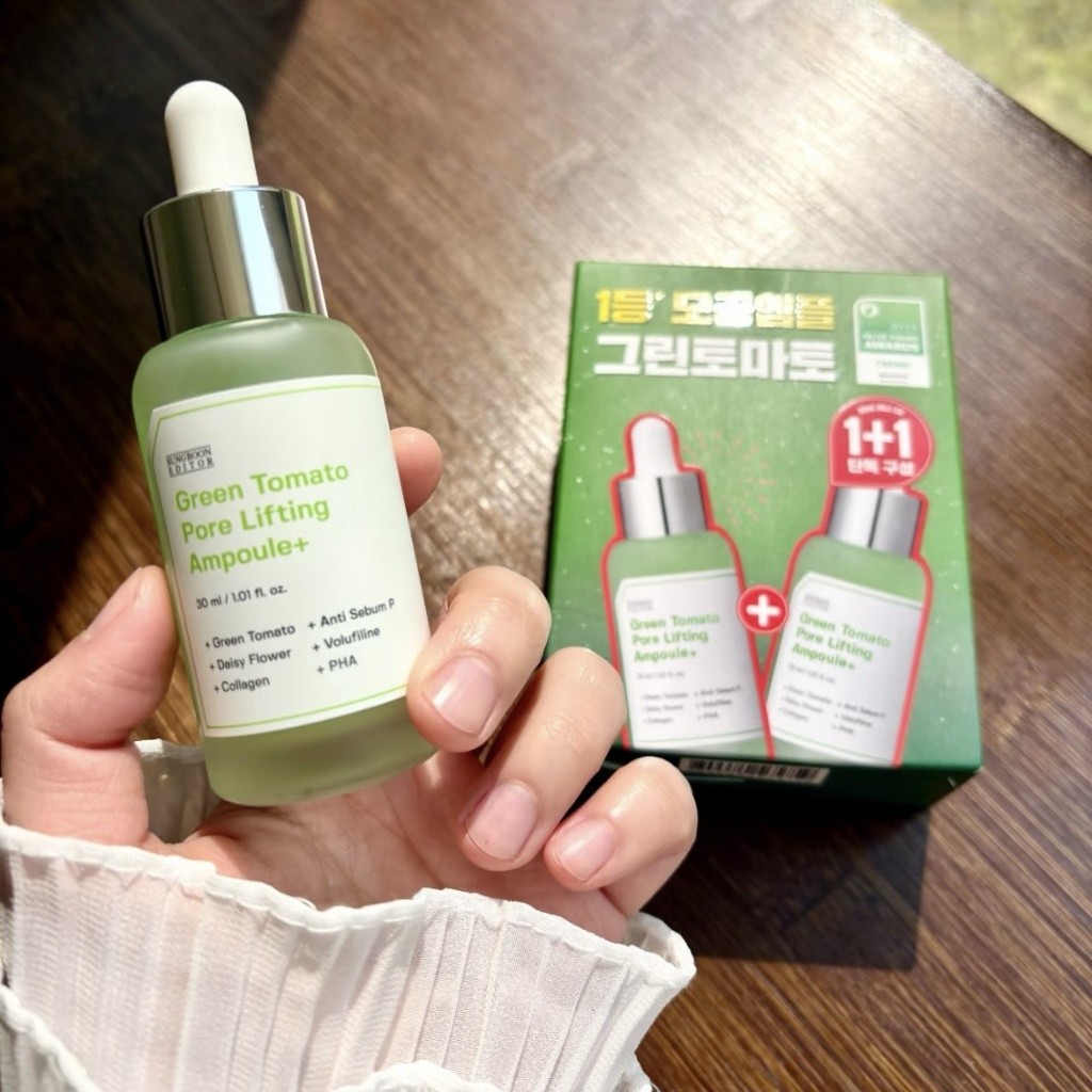 SUNGBOON EDITOR 綠番茄毛孔緊緻安瓶擁有水感輕盈質地,擦上後迅速吸收,不會留下油膩感,適合各種膚質使用,特別推薦給油性與混合性肌膚的人,作為日常護膚的最佳選擇!