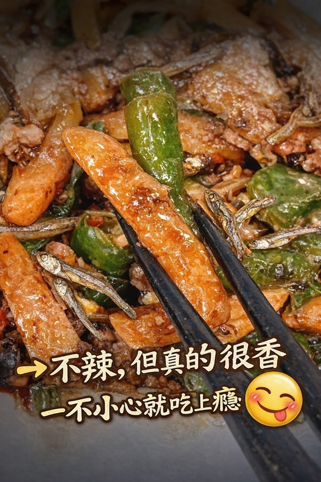 糯米椒本身不辣,但有一種很溫潤的椒香,配上丁香魚、豆乾,還有那個靈魂豆豉...